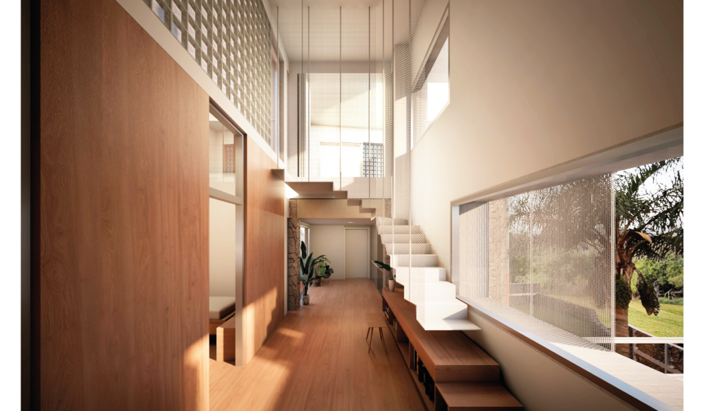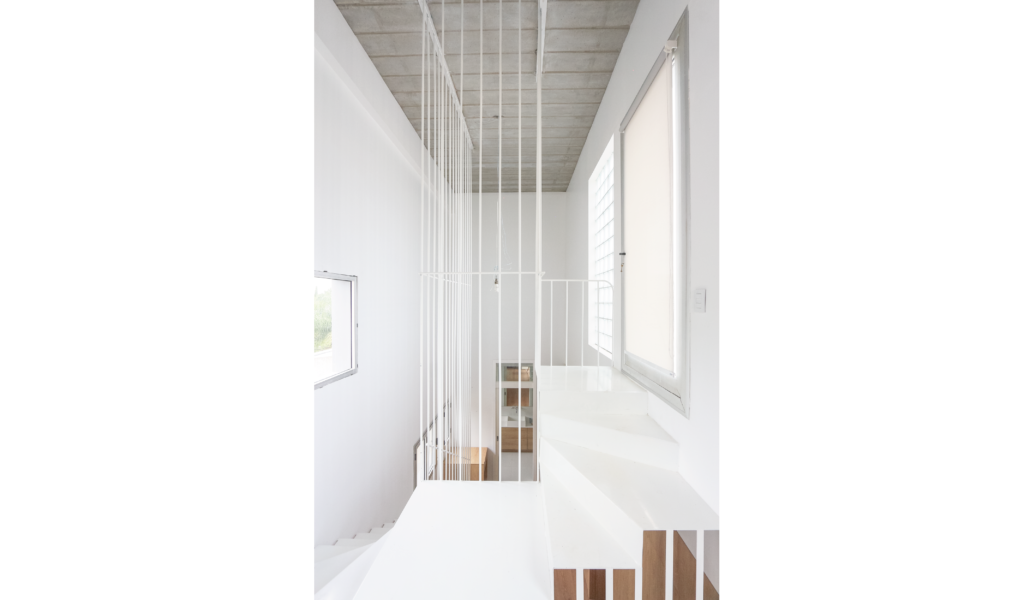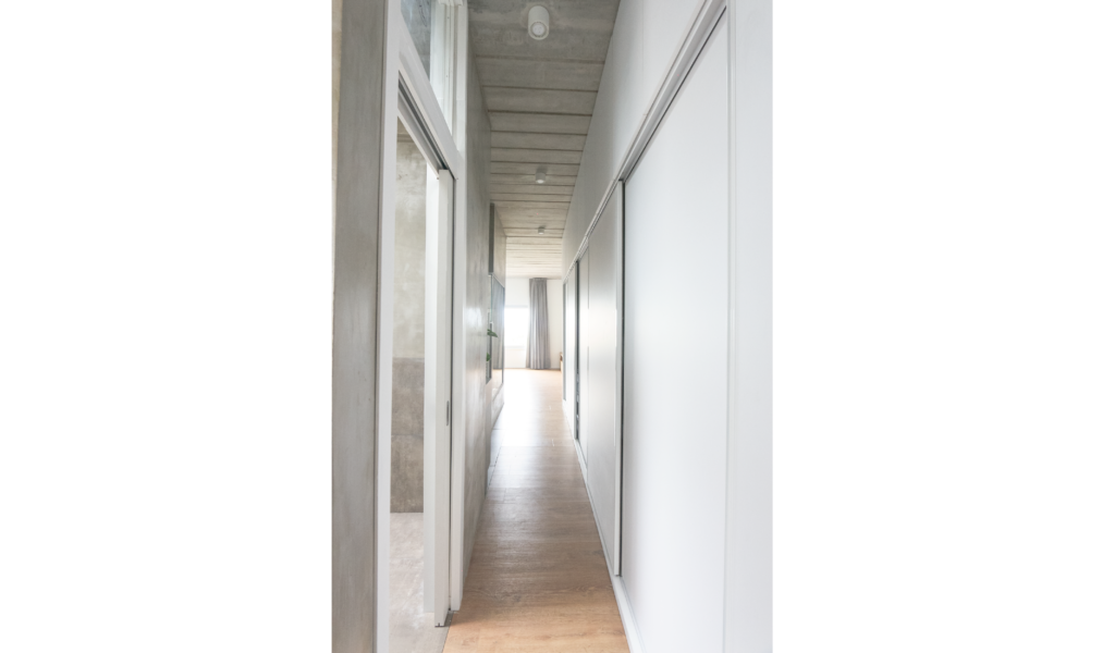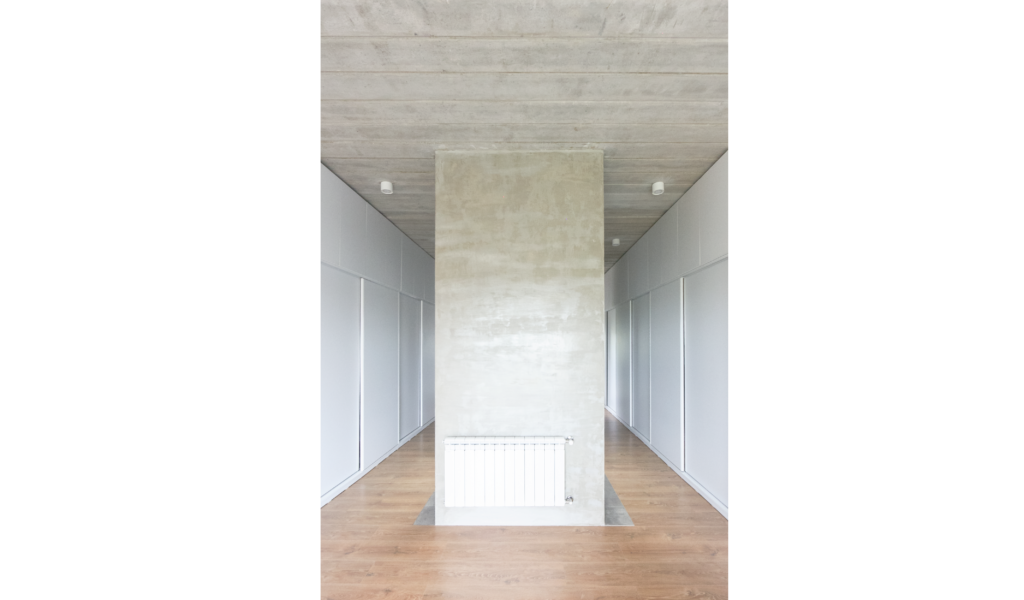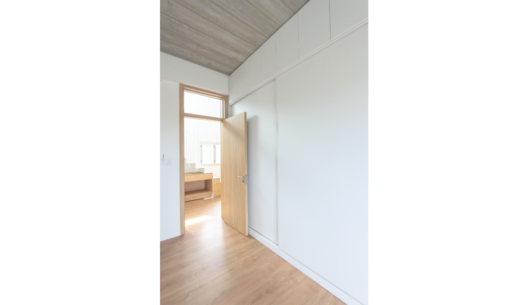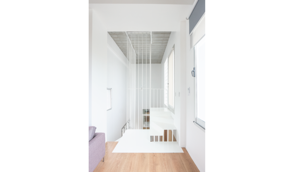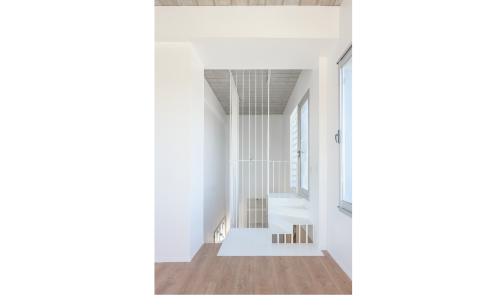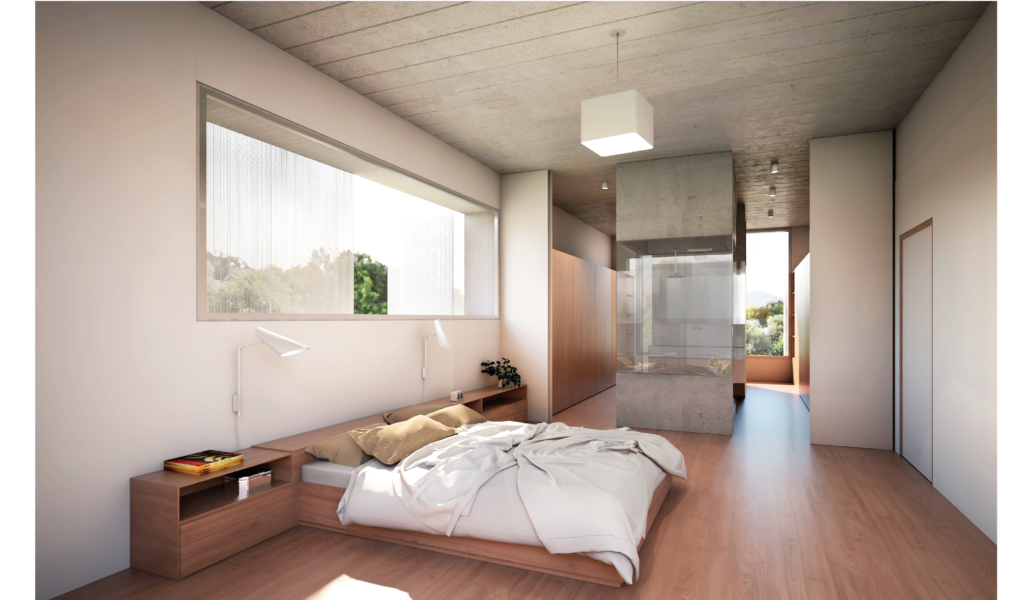 Los dormitorios dan al nor-oeste y el ‘paso-médula-corazón’ al sur-este. Los dormitorios de escala acogedora, espejados entre si y el núcleo alto de visuales cruzadas infinitas que dan cuenta la escala de la intervención.
