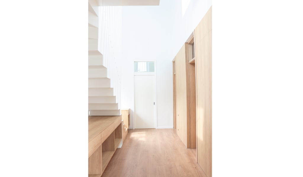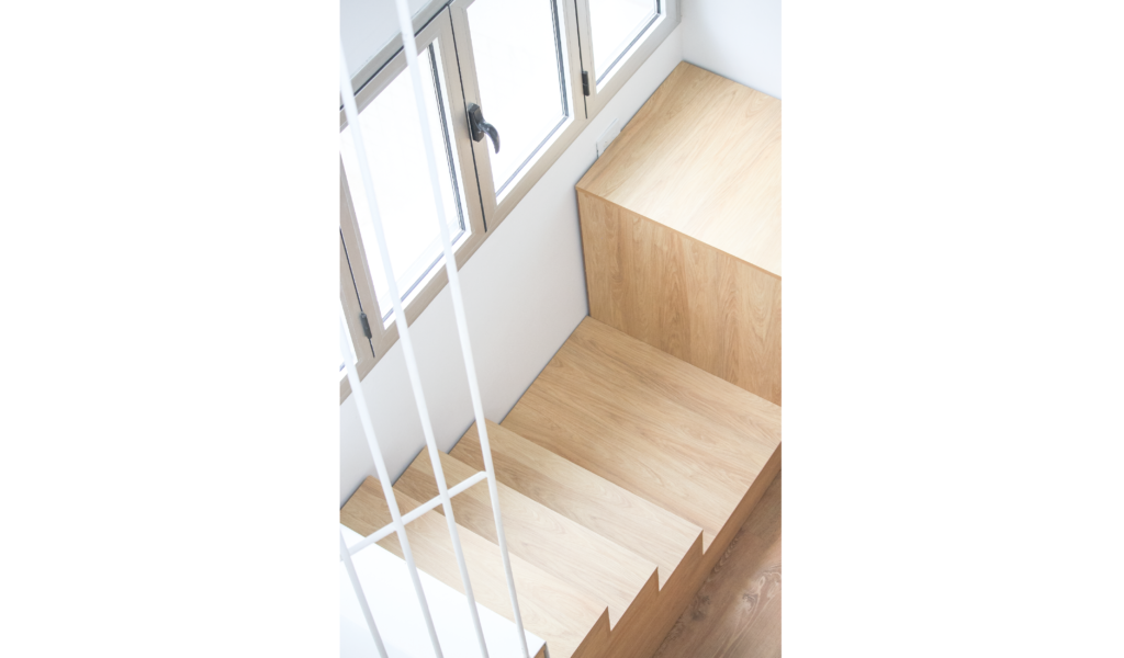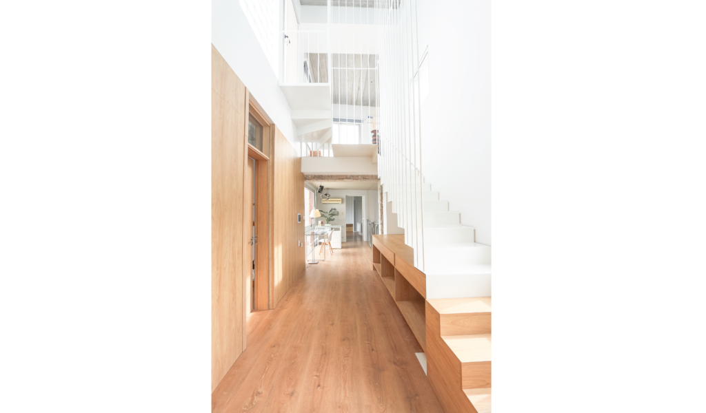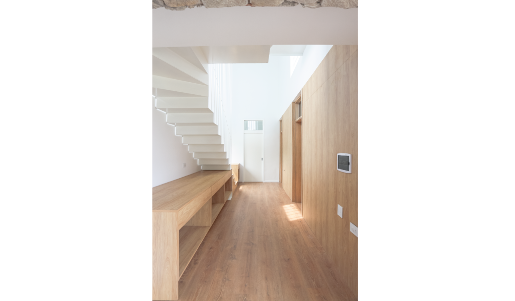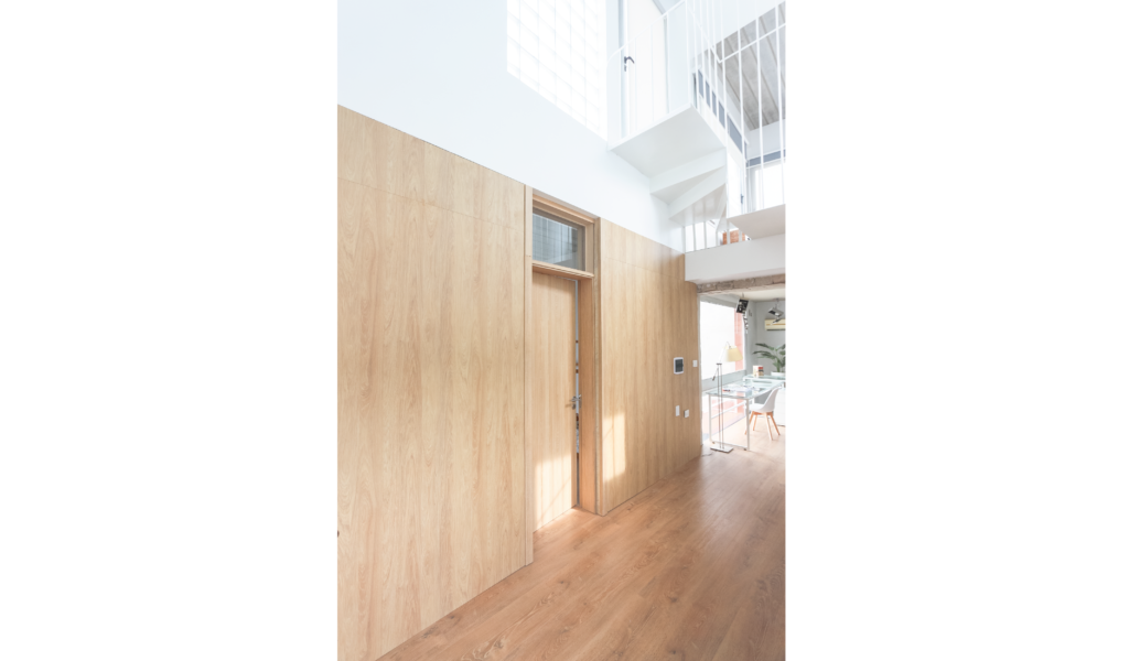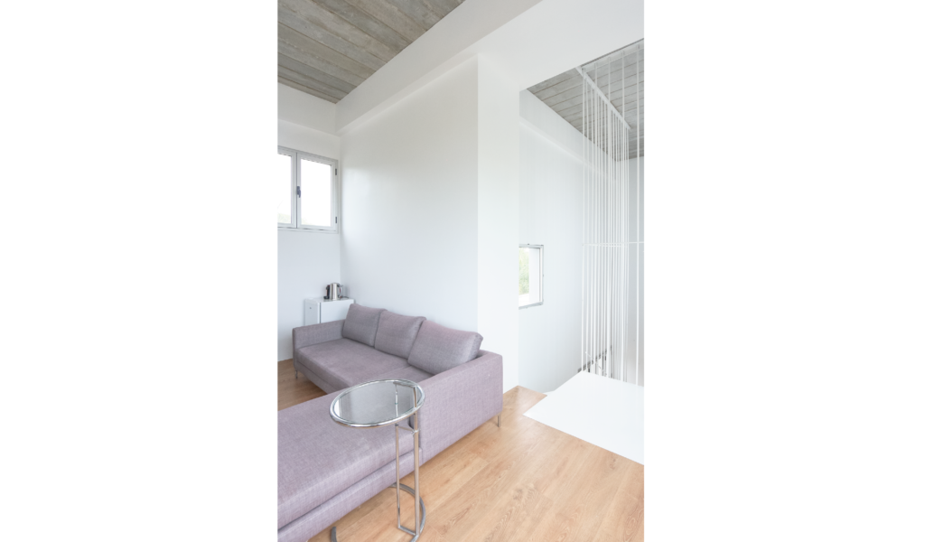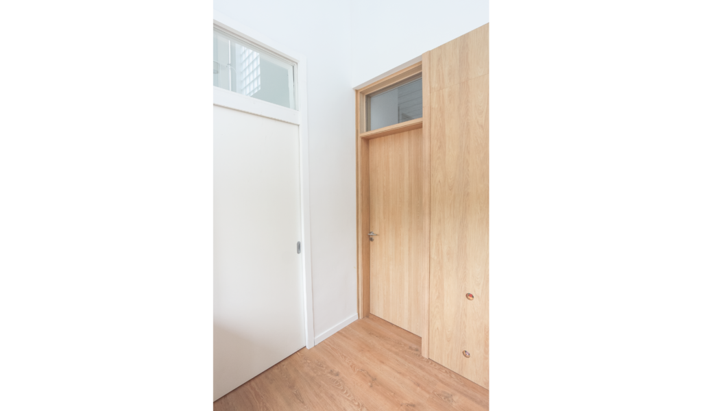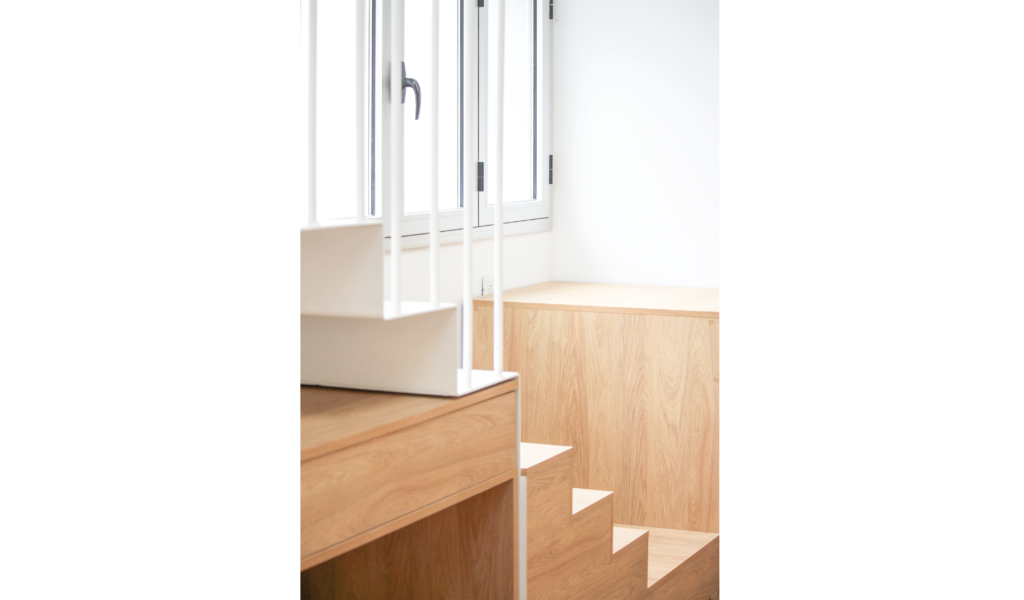 Los dormitorios dan al nor-oeste y el ‘paso-médula-corazón’ al sur-este. Los dormitorios de escala acogedora, espejados entre si y el núcleo alto de visuales cruzadas infinitas que dan cuenta la escala de la intervención.