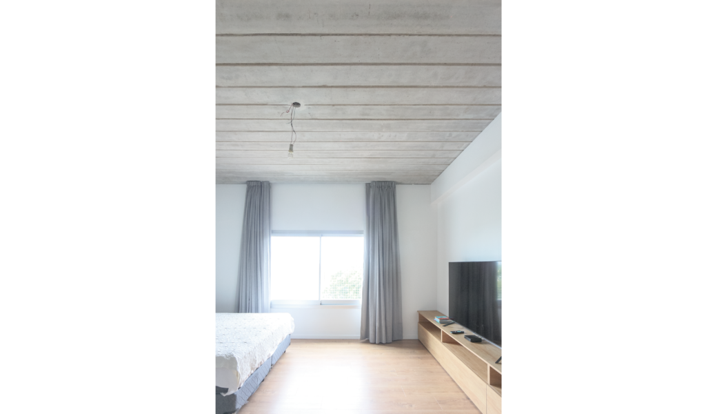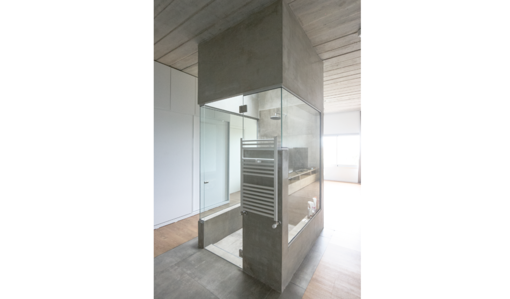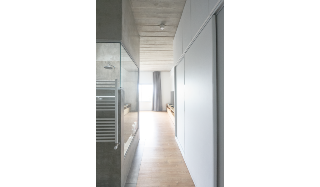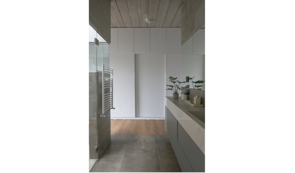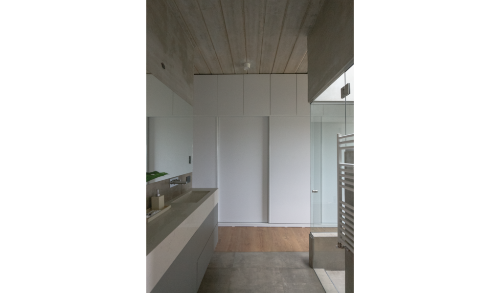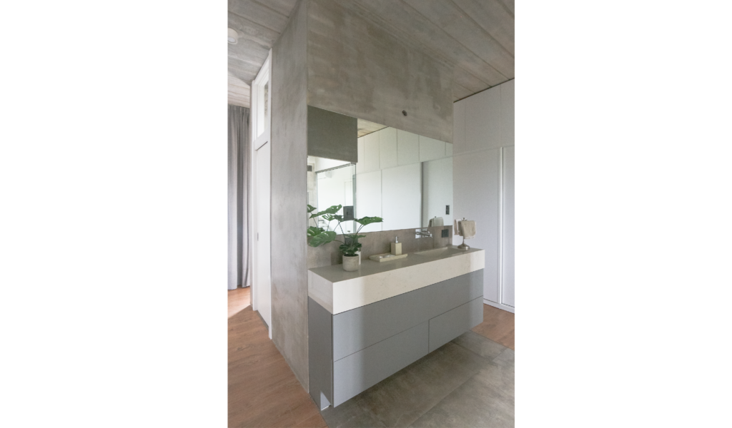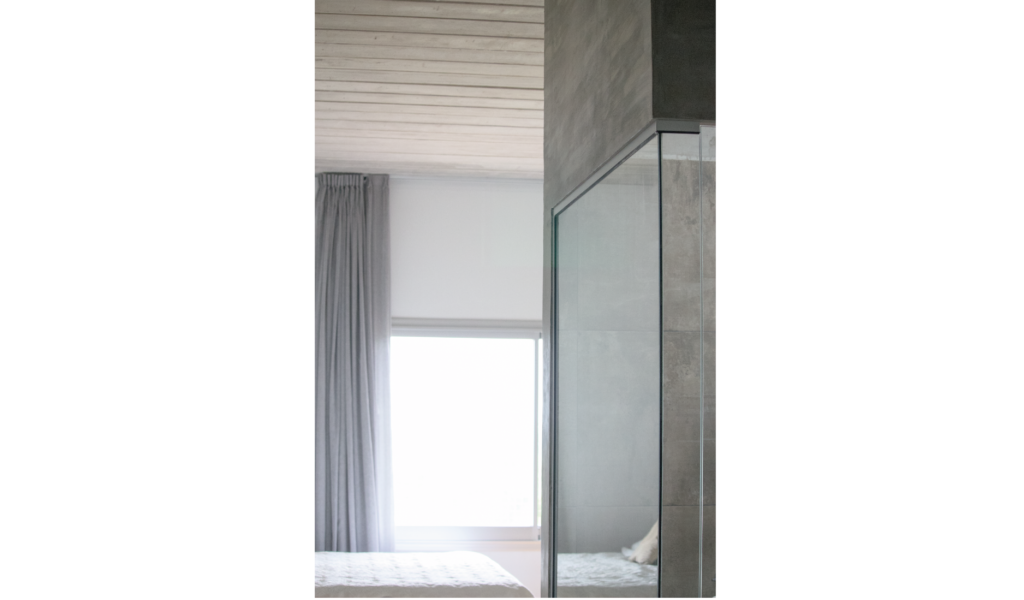 La habitación en suite se implanta sobre el ala larga que poseía la vivienda. Se extiende de norte a sur y busca aprovechar está línea sin divisiones, ordenando dormitorio + vestidor + ducha, lavatorio y baño explotando la intimidad que una suite posibilita. De esta forma el interior del local se ensancha y la ventilación se cruza. El bloque del baño se retrae al centro y se sostiene gris monocromo diferenciado del resto.