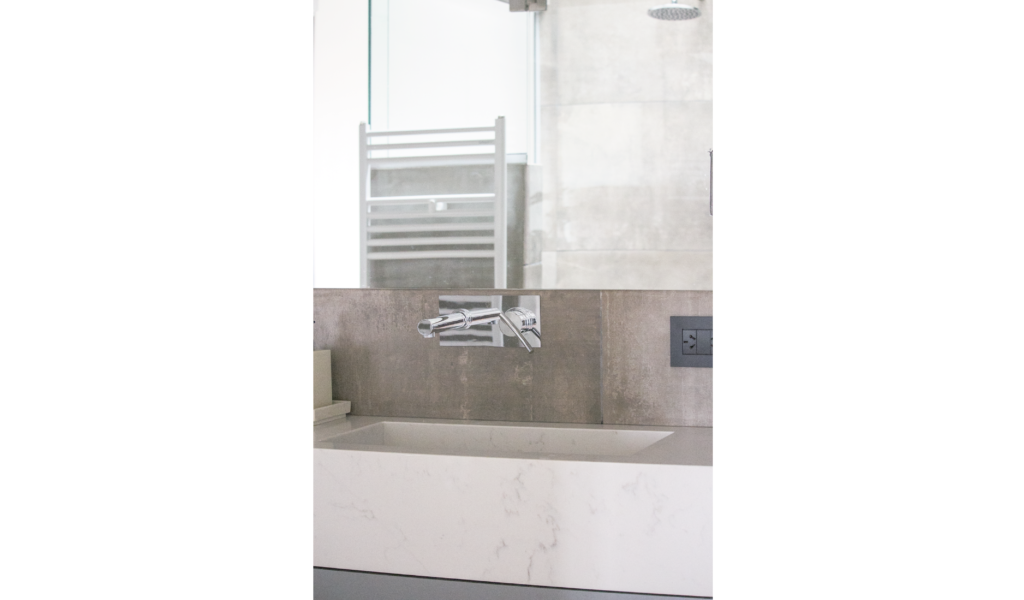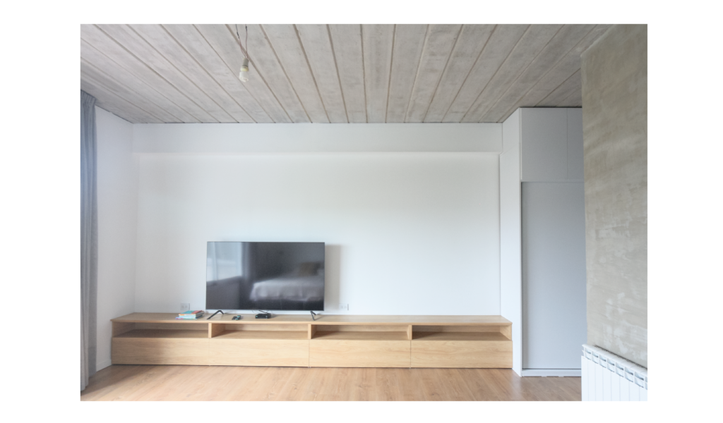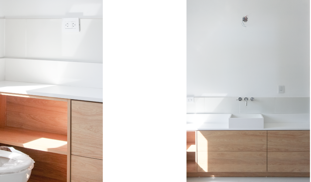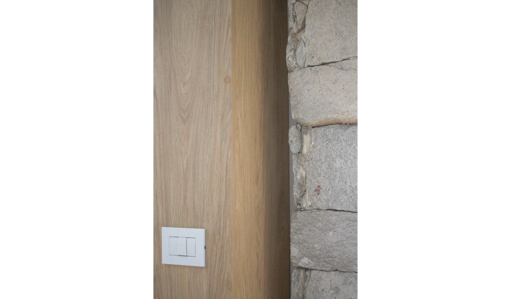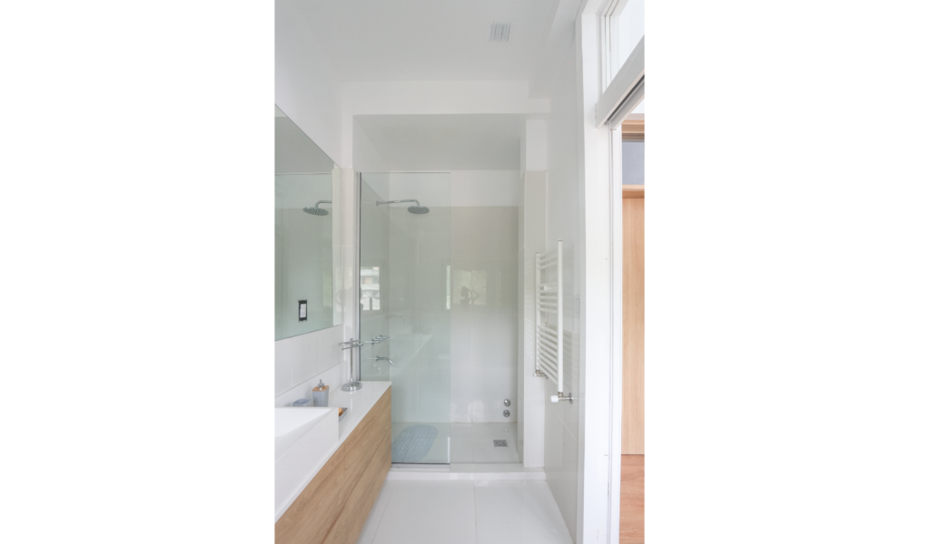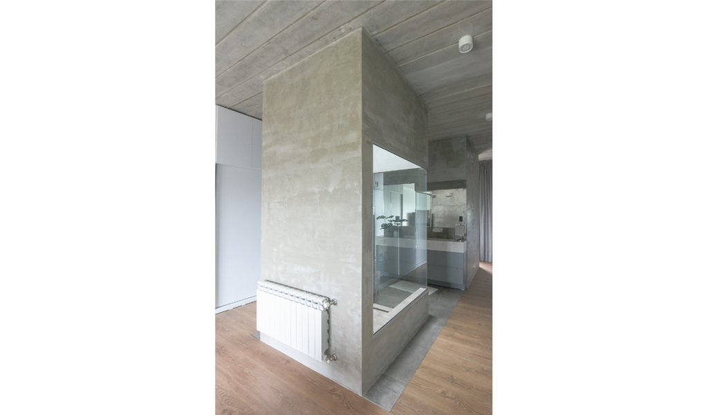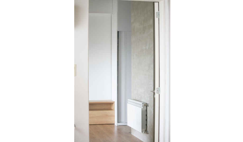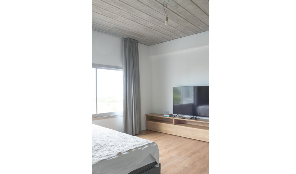 La habitación en suite se implanta sobre el ala larga que poseía la vivienda. Se extiende de norte a sur y busca aprovechar está línea sin divisiones, ordenando dormitorio + vestidor + ducha, lavatorio y baño explotando la intimidad que una suite posibilita. De esta forma el interior del local se ensancha y la ventilación se cruza. El bloque del baño se retrae al centro y se sostiene gris monocromo diferenciado del resto.