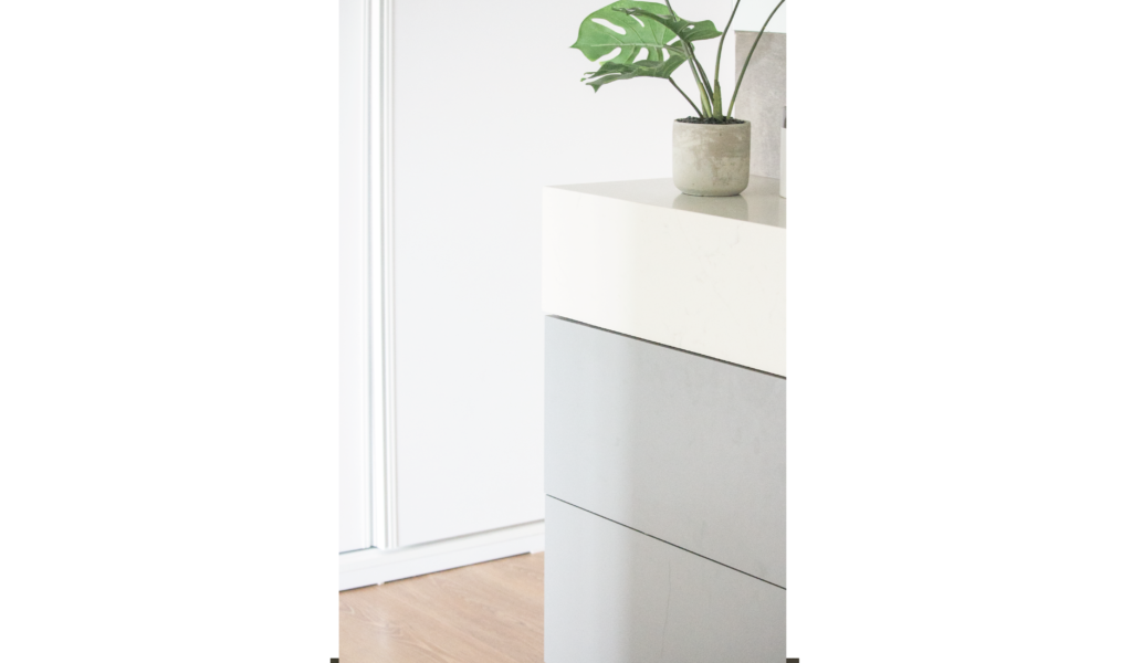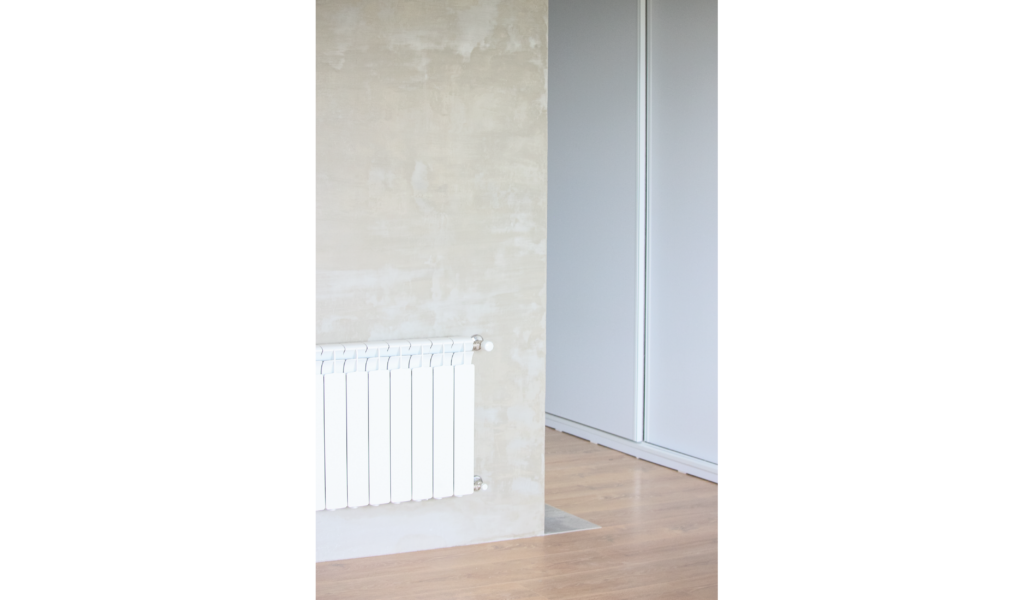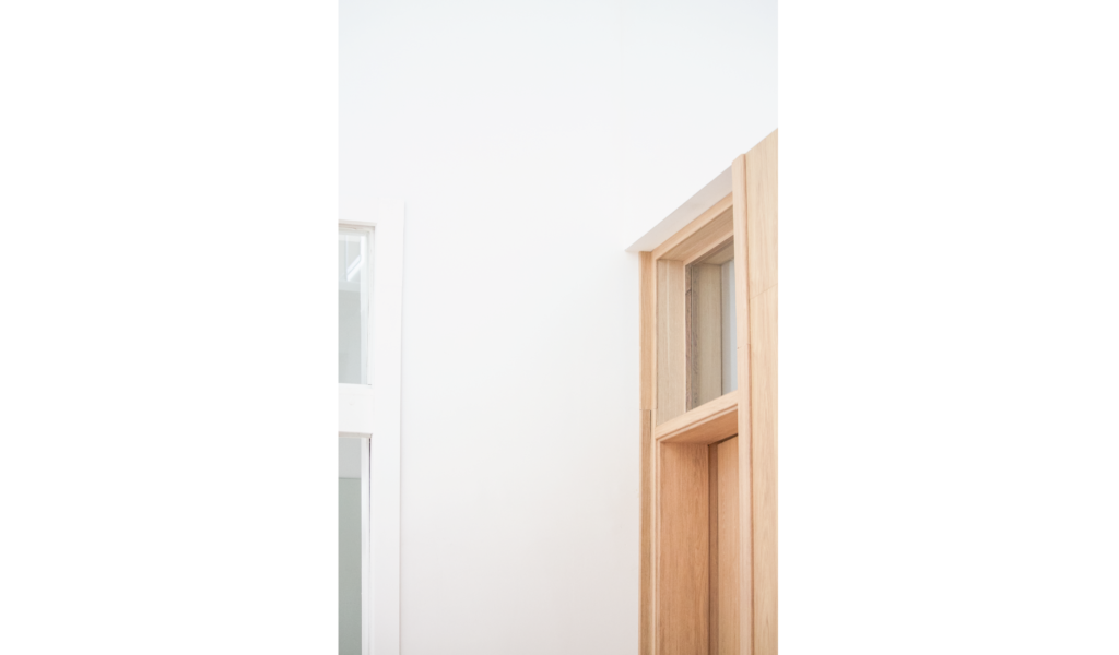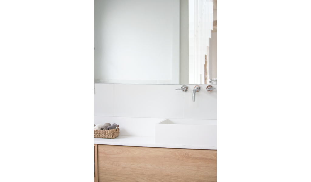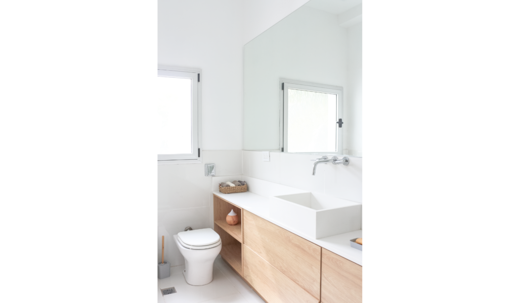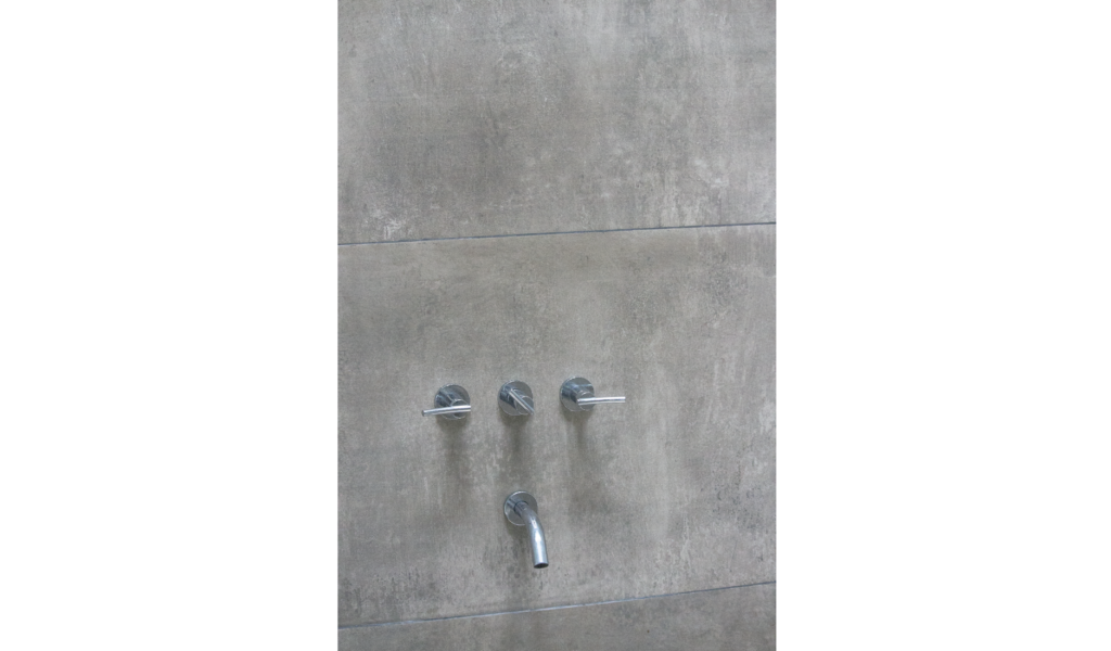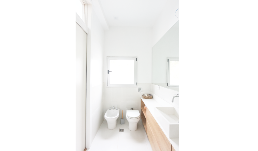 La habitación en suite se implanta sobre el ala larga que poseía la vivienda. Se extiende de norte a sur y busca aprovechar está línea sin divisiones, ordenando dormitorio + vestidor + ducha, lavatorio y baño explotando la intimidad que una suite posibilita. De esta forma el interior del local se ensancha y la ventilación se cruza. El bloque del baño se retrae al centro y se sostiene gris monocromo diferenciado del resto.