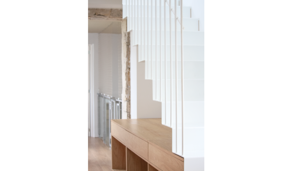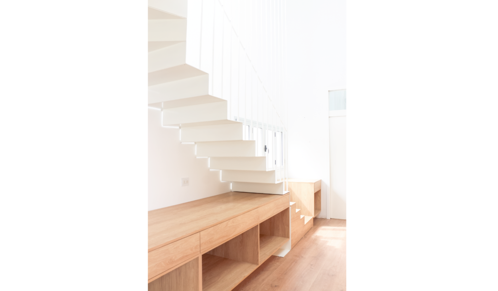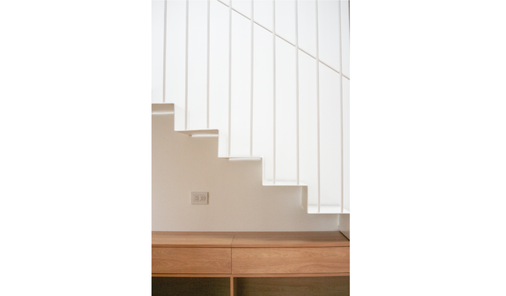 El ala más ancha alberga varias funciones. La escalera propone liberar el abajo para hacerlo un espacio aprovechable al máximo, este abajo que es recibidor y repartidor, área de juego y de trabajo o lectura. Este despegue del piso nos permite transformar un pasillo / conector en un área central. Propone a su vez un recorrido que permite descubrir la intervención que va sucediendo a medios niveles, escalones asientos, mueble guardado, vistas recortes de paisaje, espacio sum, para terminar en dos terrazas con panorámicas al río y la ciudad.