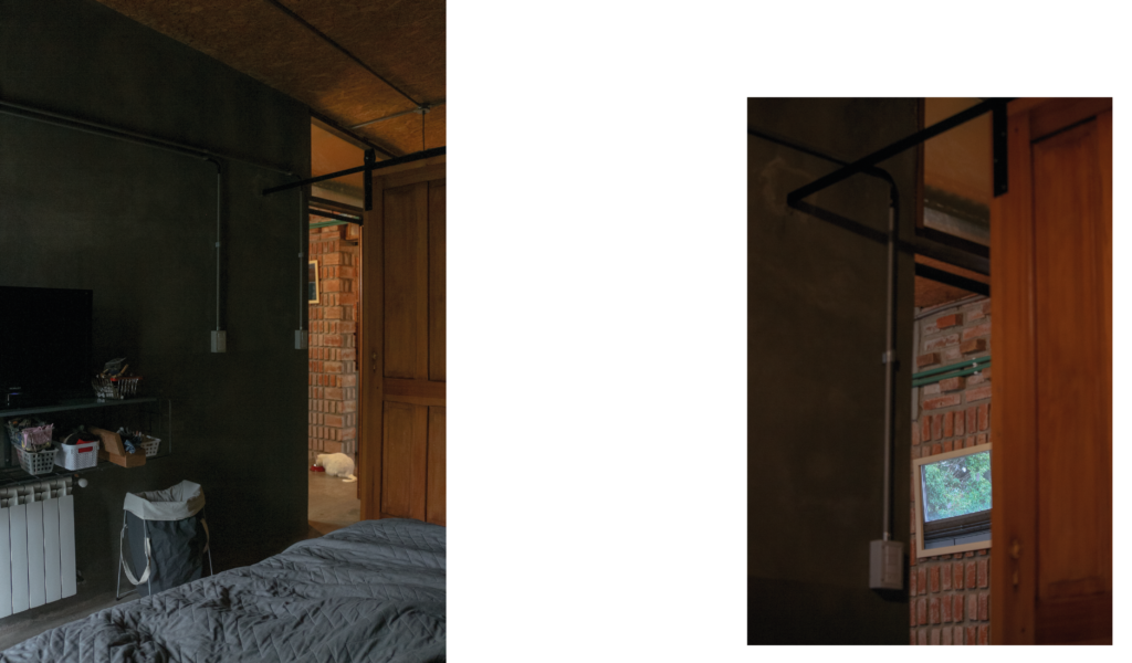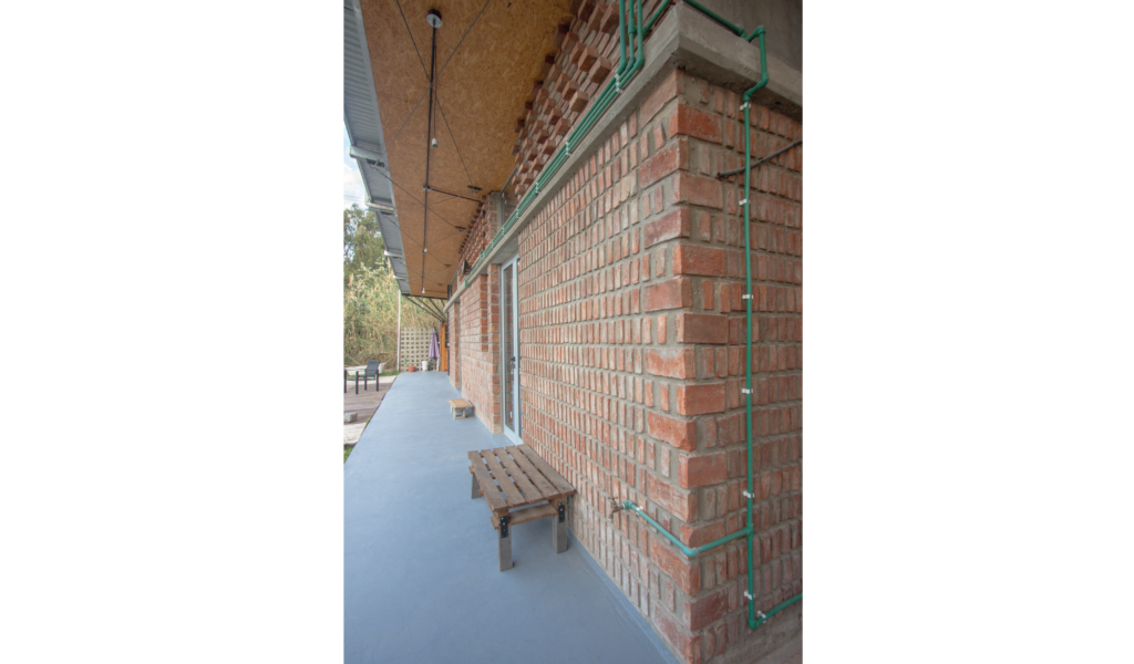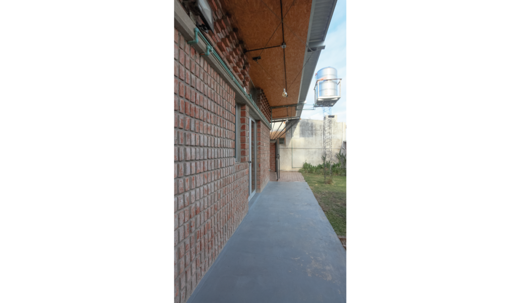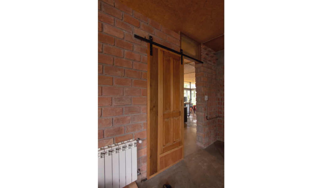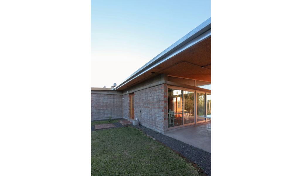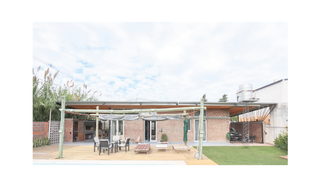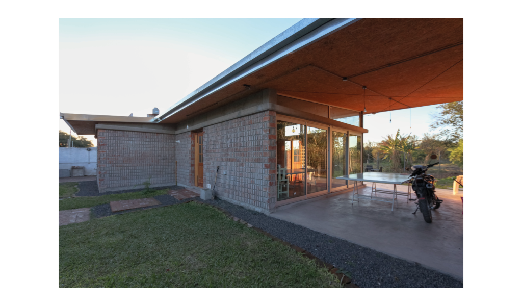 La vivienda busca sustentabilidad, adopta así acondicionamiento con sistema de radiadores por caldera dual y el tratamiento de aguas mediante el uso de biodigestor, la optimización de materiales fue realizada a través de la modulación para evitar cortes y desperdicios tanto en perfilerías, hierros, chapas y placas de cielorrasos. Las aberturas interiores son recicladas, el cerramiento de mampostería de ladrillo visto en ambas caras con aparejo de librero resigna la necesidad de revoques, todas las instalaciones son expuestas al exterior. El proyecto muestra íntegramente su sistema constructivo.