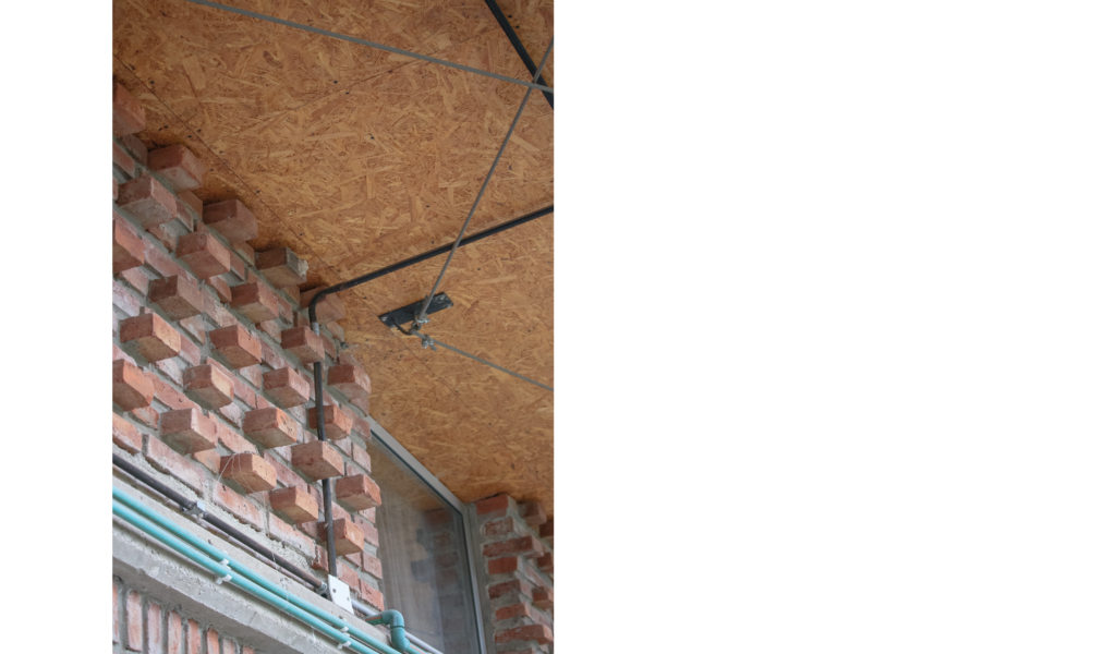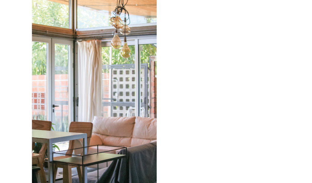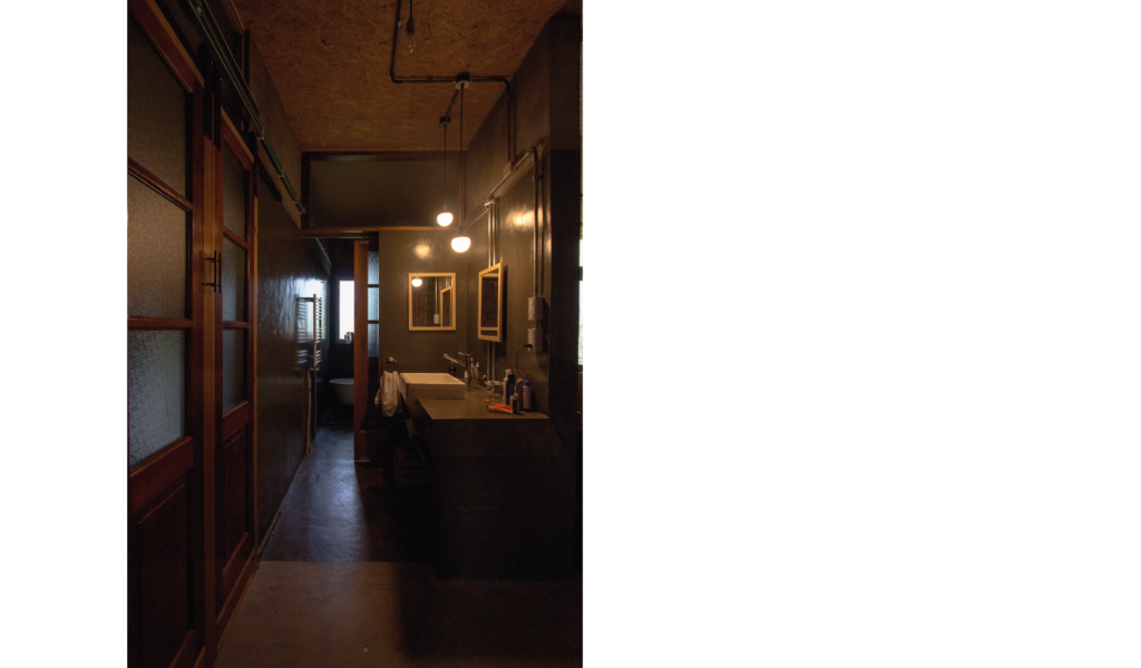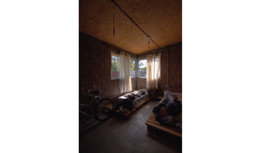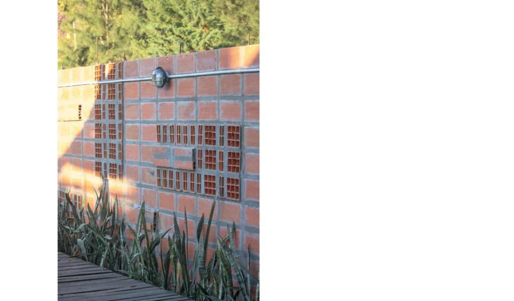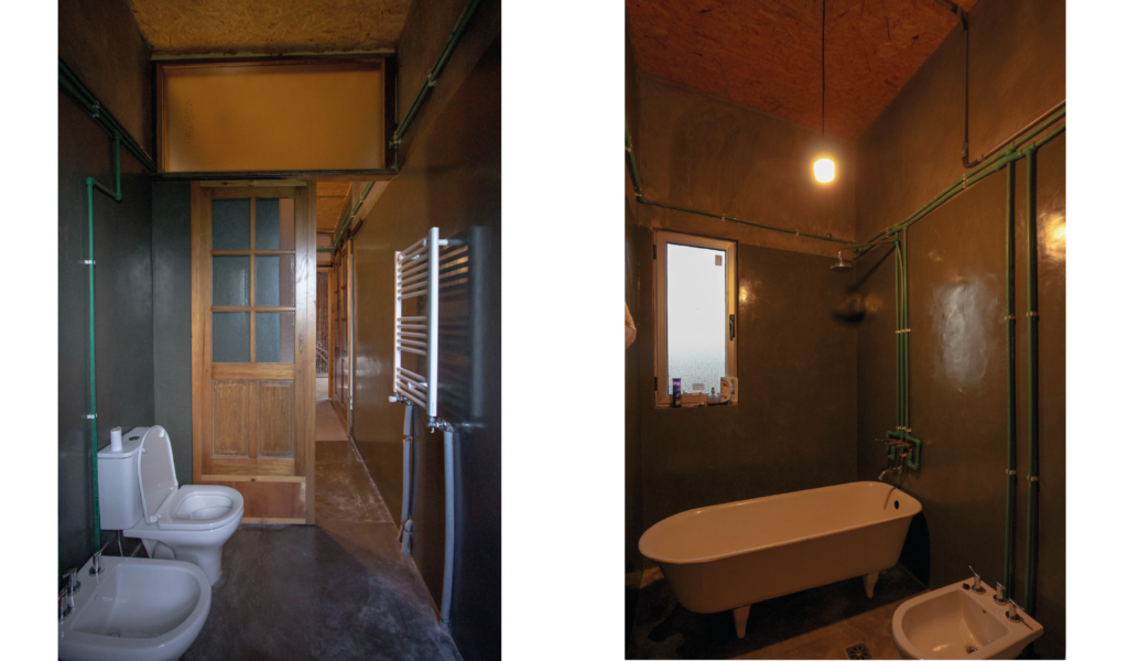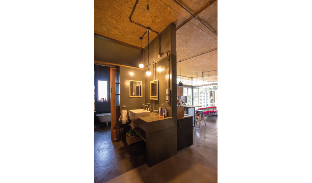La vivienda busca sustentabilidad, adopta así acondicionamiento con sistema de radiadores por caldera dual y el tratamiento de aguas mediante el uso de biodigestor, la optimización de materiales fue realizada a través de la modulación para evitar cortes y desperdicios tanto en perfilerías, hierros, chapas y placas de cielorrasos. Las aberturas interiores son recicladas, el cerramiento de mampostería de ladrillo visto en ambas caras con aparejo de librero resigna la necesidad de revoques, todas las instalaciones son expuestas al exterior. El proyecto muestra íntegramente su sistema constructivo.