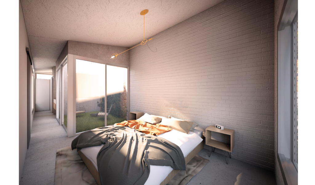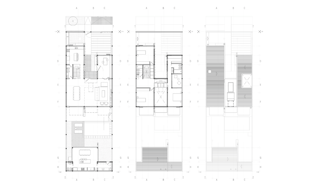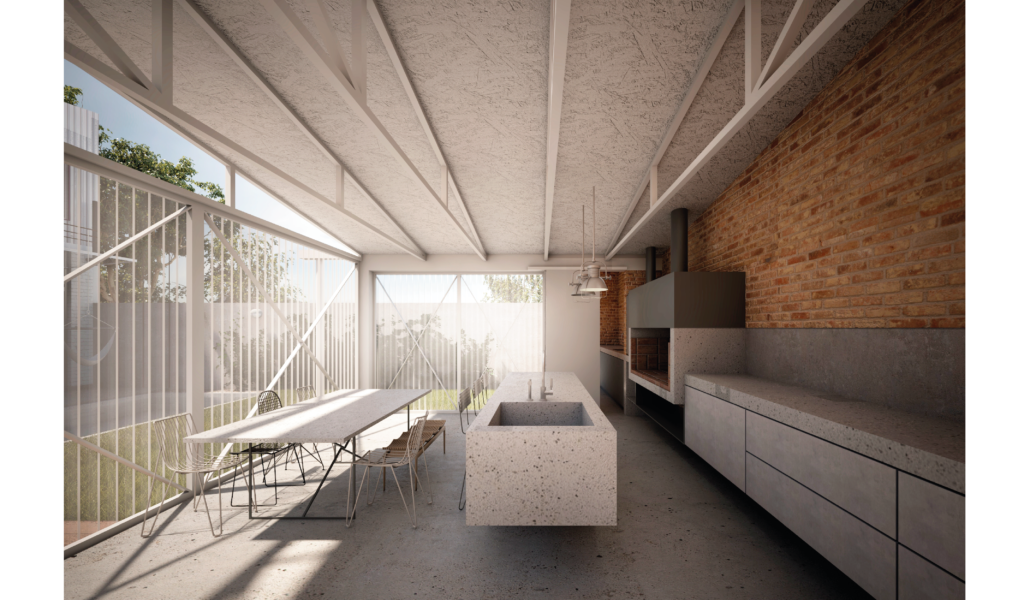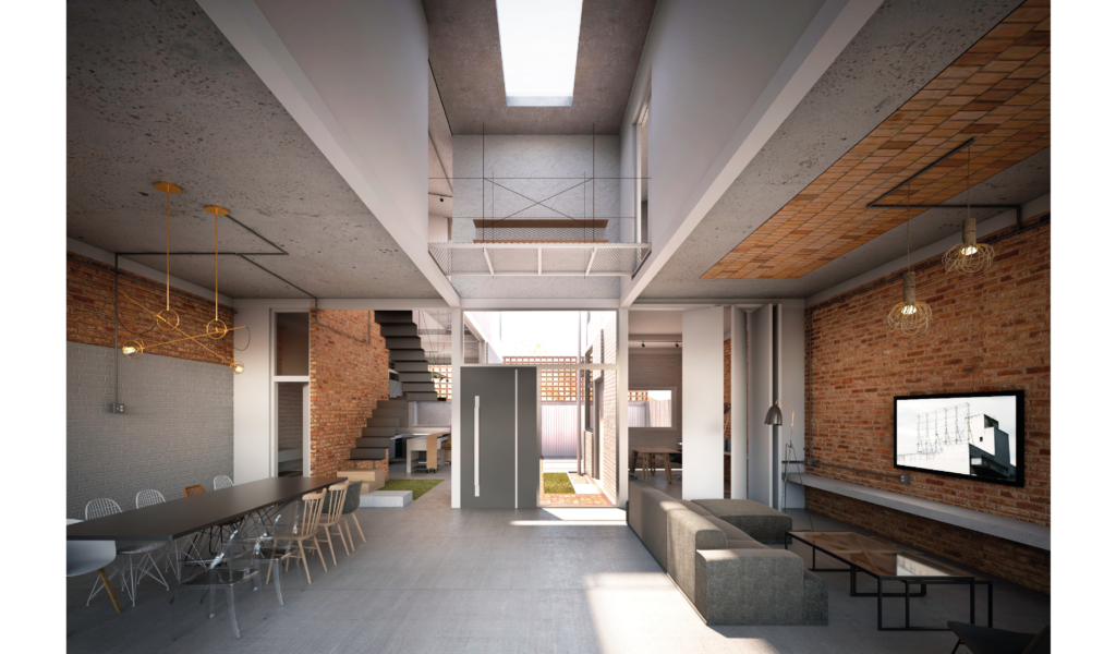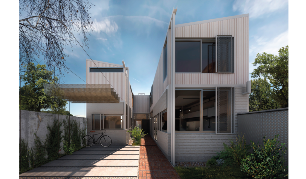 En un terreno de 10×30, un retiro de frente y un ingreso con vista al patio buscan otorgar profundidad a un planteo compacto. El proyecto se estructura a través de dos espigas unidas por un espacio en doble altura.