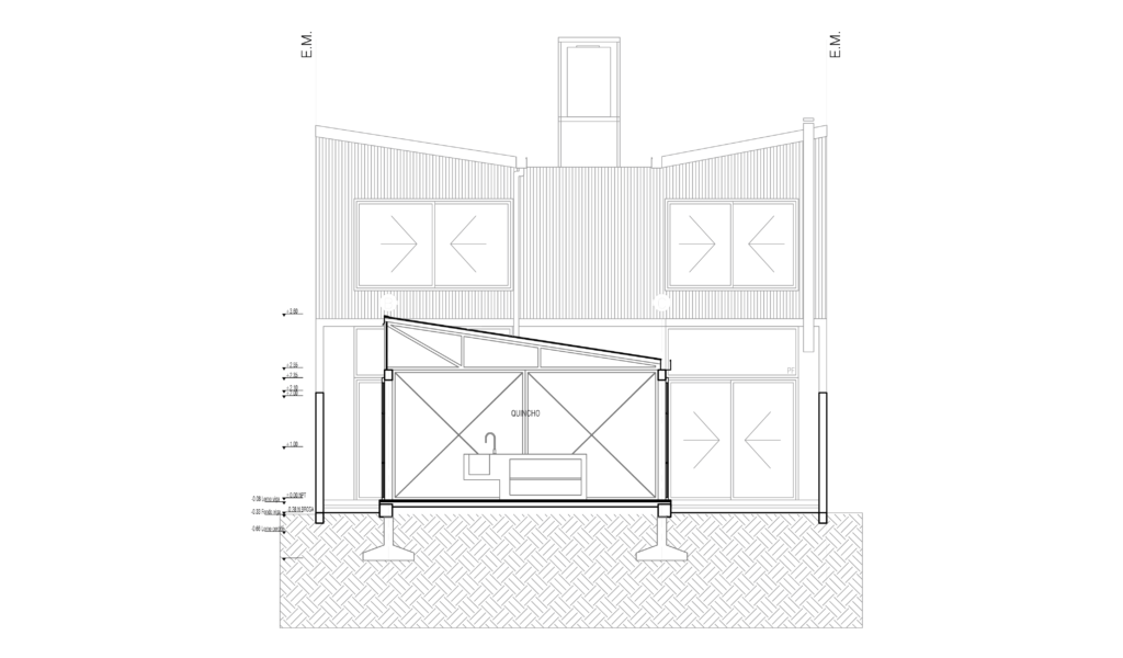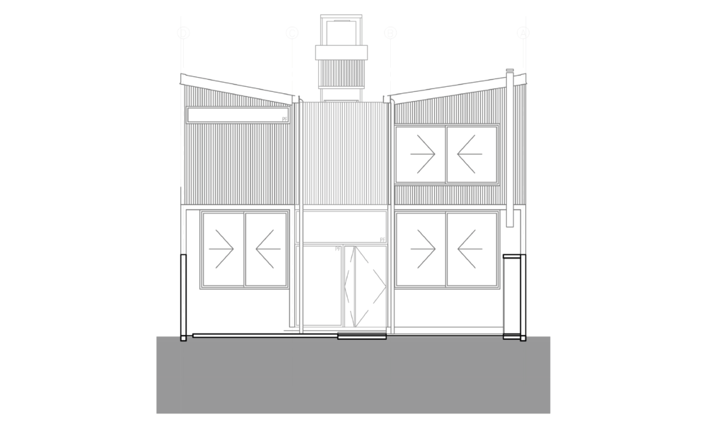 En la fachada un muro alto cribado a-las de interfase separa la vivienda de la calle, y le permite abrirse a todos sus patios sin perder privacidad.