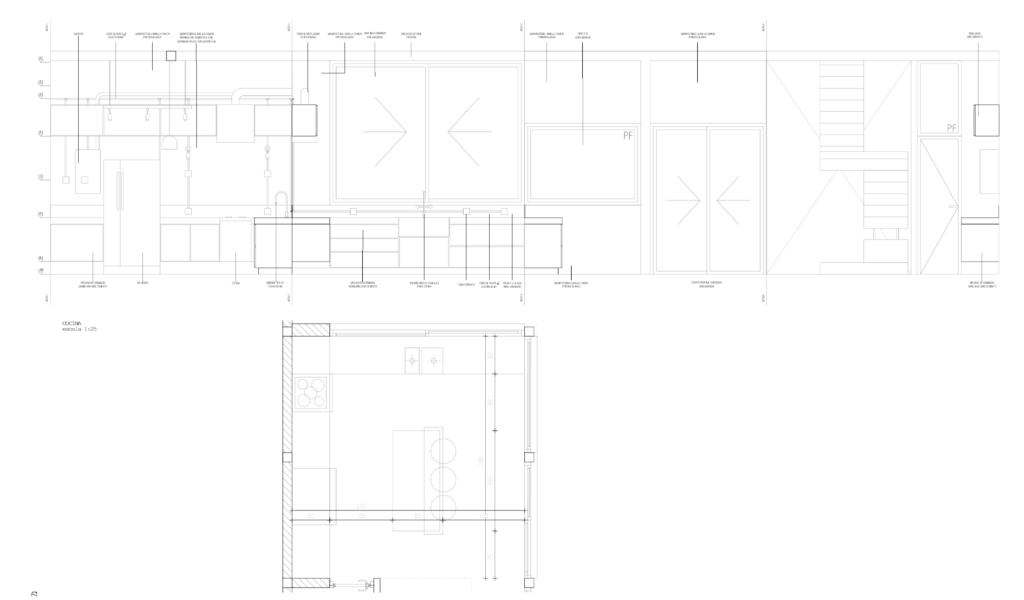 En planta baja de un lado cochera+escritorio+living y del otro cocina+núcleo escalera+baño+comedor.
