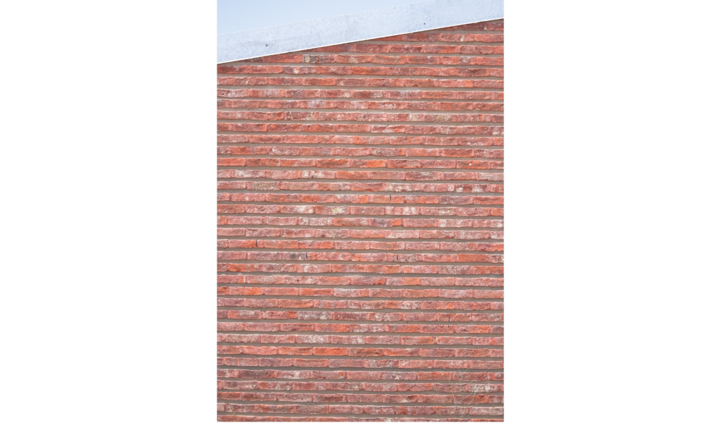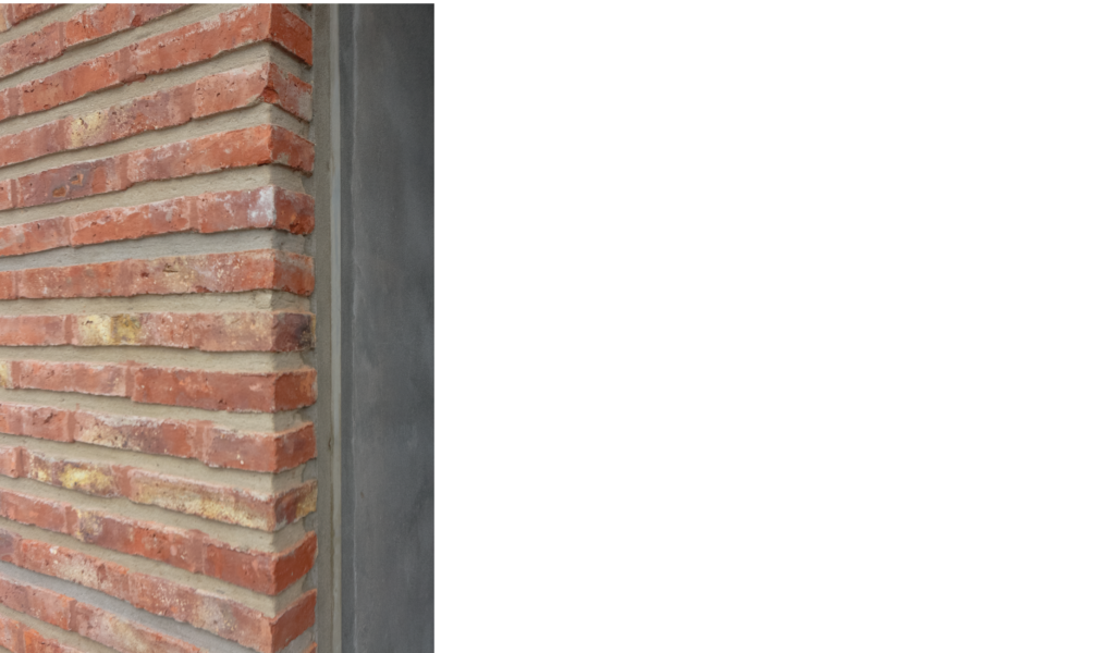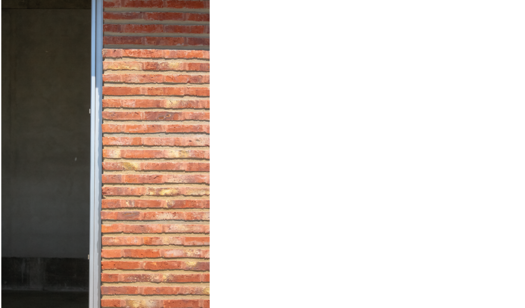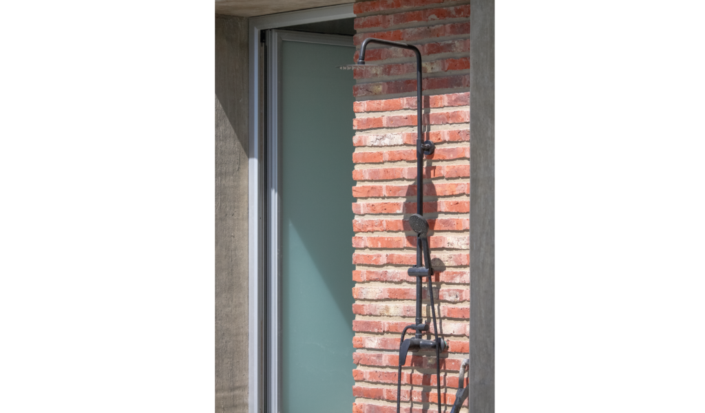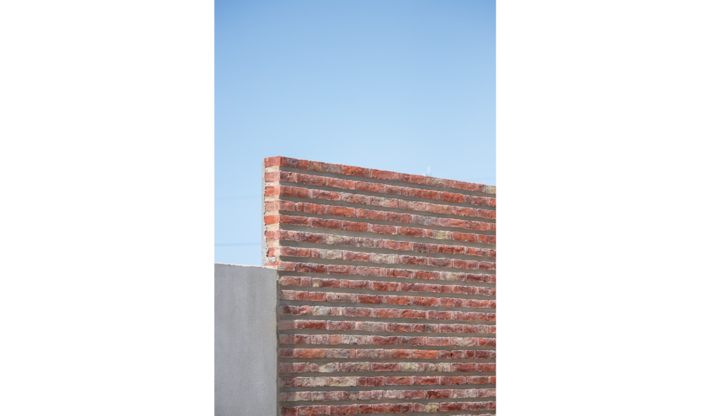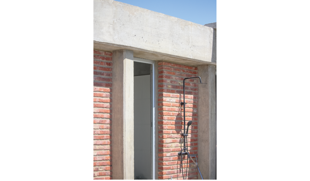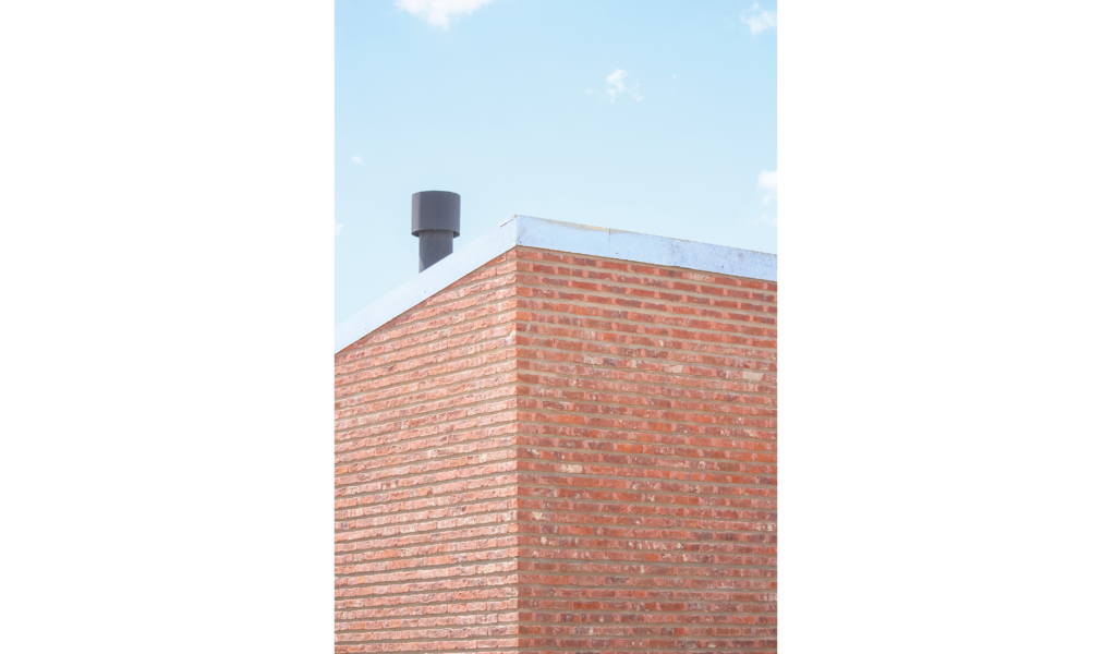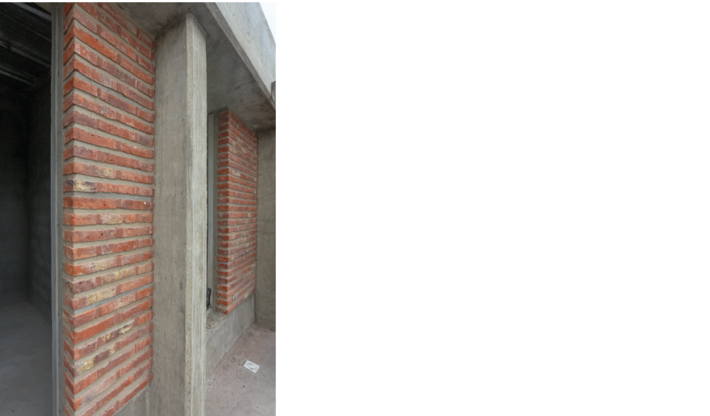 El exterior se realiza integro de ladrillo visto con junta tomada horizontal + estructuras de hormigón visto que se ven también desde el interior. La búsqueda material oscila entre lo crudo: hormigón y ladrillos +- algunos puntos estratégicos revocados o revestidos, lo mismo sucede con la instalación eléctrica que de momentos sale para el exterior de la pared para terminar de componer la arquitectura. La costilla de servicios se mantiene diferenciada por sus detalles de revestimiento en placas que a veces son muebles: recibidor, escalera, toilette, almacén, lavadero.
